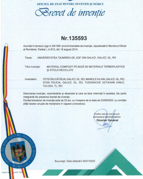 Ionuţ Octavian Tudorache, directorul JT Grup Tulcea, în colaborare cu o echipă de cercetători de la Universitatea „Dunărea de Jos” din Galaţi (UDJG), a reuşit o performanţă remarcabilă: obţinerea unui brevet de invenţie de la Oficiul de Stat pentru Invenţii şi Mărci (OSIM) pentru un procedeu de realizare a unui material compozit inovator, obţinut prin combinarea materialelor termoplastice reciclate cu sticlă sfărâmată prin implozie şi pigmenţi anorganici.