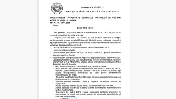„Nu a fost cazul dispunerii măsurii de suspendare de activitate. Nu au fost identificate neconformităţi legate de igienă, circuitele funcţionale sau de întocmire a documentaţiei. Unităţile sanitare controlate deţin şi respectă autorizaţiile sanitare de funcţionare”, a transmis DSP Tulcea, la solicitarea Ziarului „Delta”.