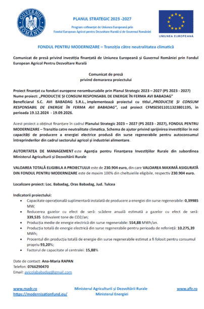 Comunicat de presă privind demararea proiectului S.C. AVI BABADAG S.R.L. Posted by Ziarul Delta | Feb 4, 2026 | Anunturi - Comunicate |