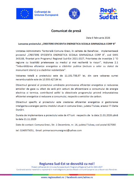 Comunicat de presă Lansarea proiectului „CRESTERE EFICIENTA ENERGETICA SCOALA GIMNAZIALA CORP B” Posted by Ziarul Delta | Feb 6, 2026 | Anunturi - Comunicate |