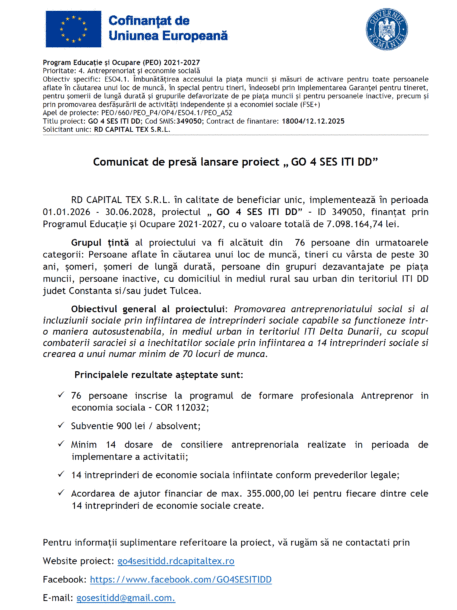 Comunicat de presă lansare proiect „ GO 4 SES ITI DD” RD CAPITAL TEX S.R.L. Posted by Ziarul Delta | Mar 4, 2026 | Anunturi - Comunicate |